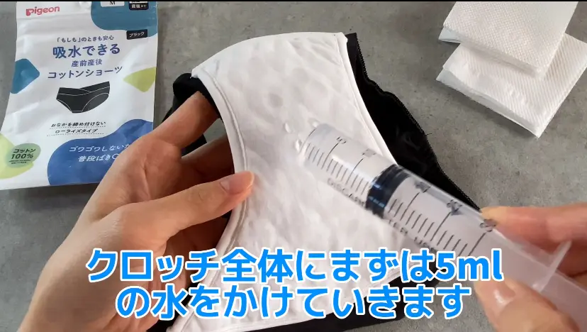 15mlの水を入れたシリンジを1本用意して、5mlずつ吸水ショーツにかけて検証しました。水をかけた後に内面と外側にキッチンペーパーを当てて水分の漏れがないかチェックします。また履いた時のショーツへかかる圧も考慮し、手で少し圧をかけて漏れがないか検証します